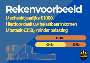 Periodiek schenken is een mogelijkheid om Gyas jaarlijks, voor minimaal 5 jaar lang, hetzelfde bedrag te schenken. Omdat u dit bedrag meerdere jaren schenkt mag u het jaarlijks aftrekken van uw belastingaangifte. Dit levert erg snel een groot voordeel op voor u omdat u minder belasting hoeft te betalen en u helpt Gyas met elk mogelijk bedrag aan de start van de verbouwing. De eis vanuit de belastingdienst is dat u minstens 5 jaar lang hetzelfde bedrag schenkt. U helpt A.G.S.R. Gyas het meest met een periodieke schenking van 15 jaar.